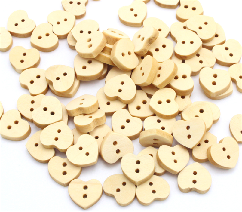 Søte hjerteknapper med to hull. Knappene er laget av tre, og fargen er naturlig trefarge.